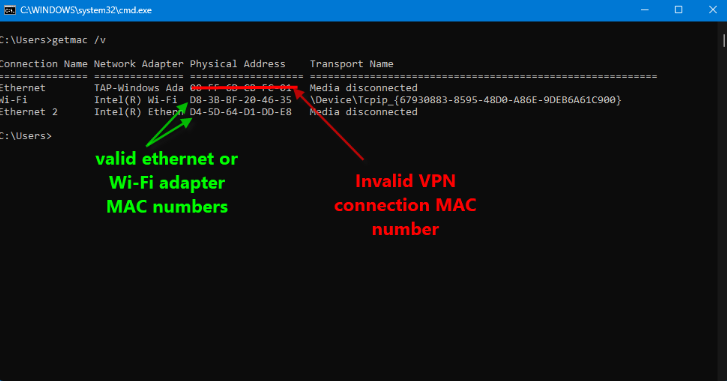 Provide one of the valid number under the Physical address column. Note that many adapters could be listed. Choose one matching a physical device in your computer. You may see other number belonging to virtual connection such as VPN. The evaluation license won’t work with virtual numbers.